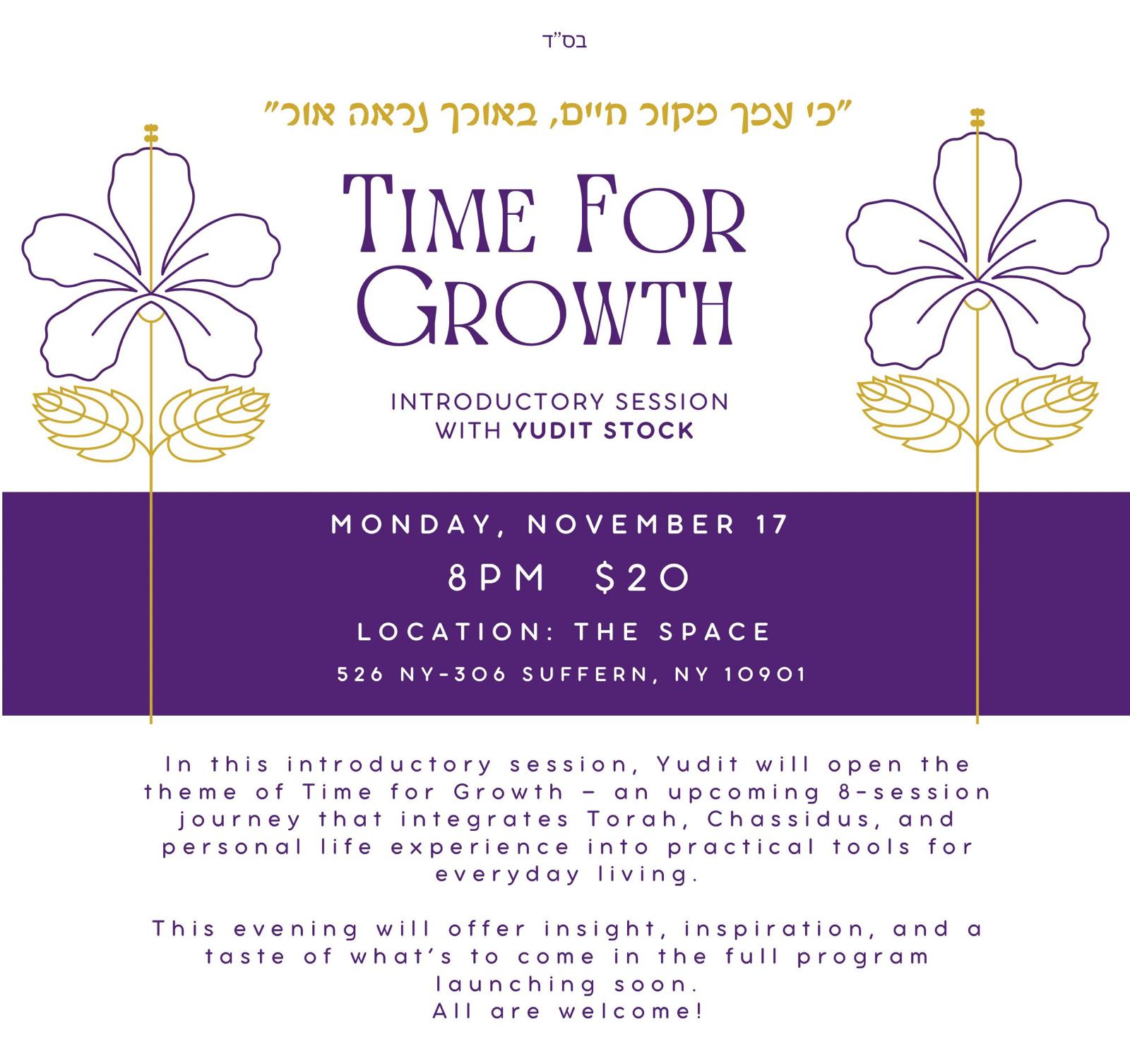In this introductory session, Yudit will open the theme of Time for Growth – an upcoming 8- session journey that integrates Torah, Chassidus, and personal life experience into practical tools for everyday living. This evening will offer insight, inspiration, and a taste of what’s to come in the full program launching soon. All are welcome!