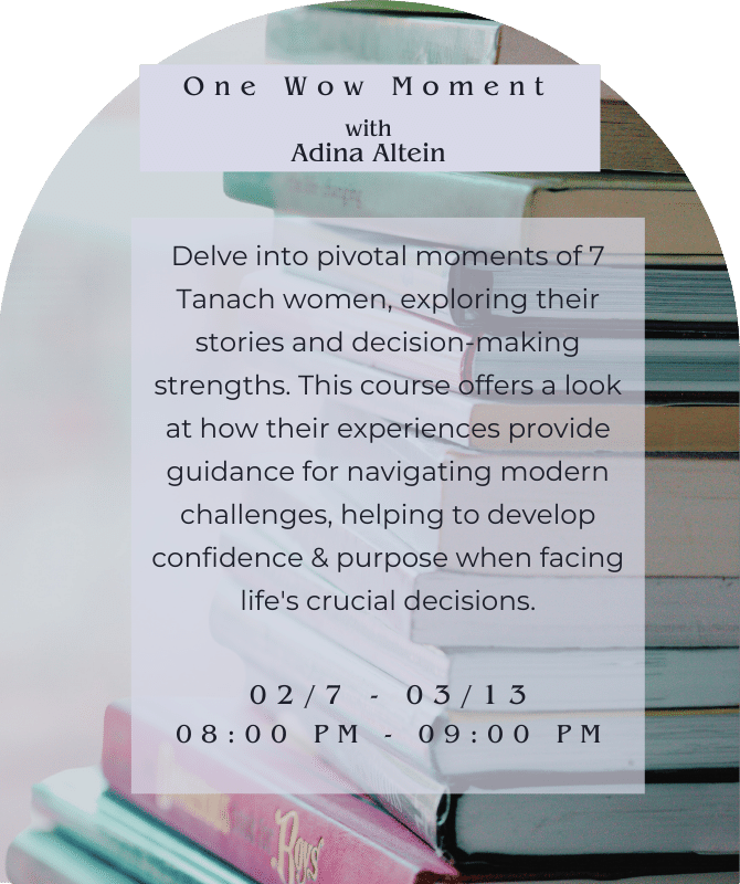 Delve into pivotal moments of 7 Tanach women, exploring their stories and decision-making strengths. This course offers a look at how their experiences provide guidance for navigating modern challenges, helping to develop confidence & purpose when facing life’s crucial decisions.